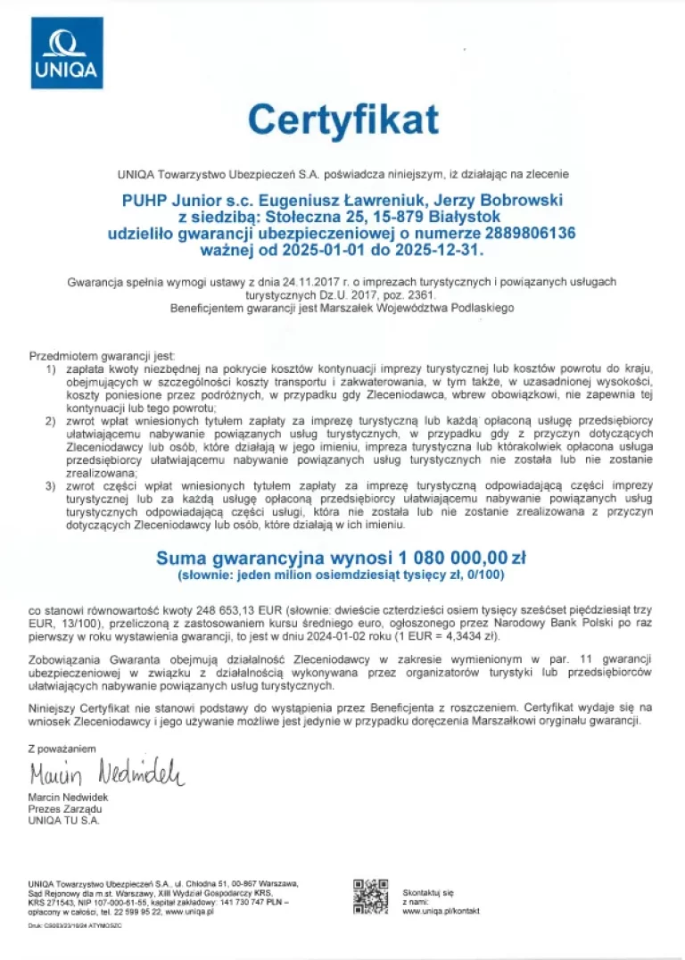 Biuro podróży Junior w Białymstoku posiada gwarancję ubezpieczeniową na kwotę 1.080.000,00 PLN wydaną przez TU UNIQA S.A. upoważniającą do organizacji imprez turystycznych w krajach europejskich i poza europejskich.